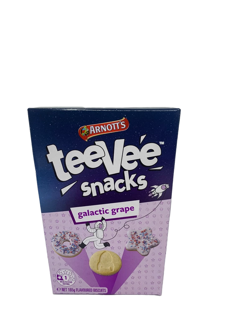 TeeVee Snacks Galactic Grape is a flavoured biscuit. Pop open for out-of-this-world bites of fun!