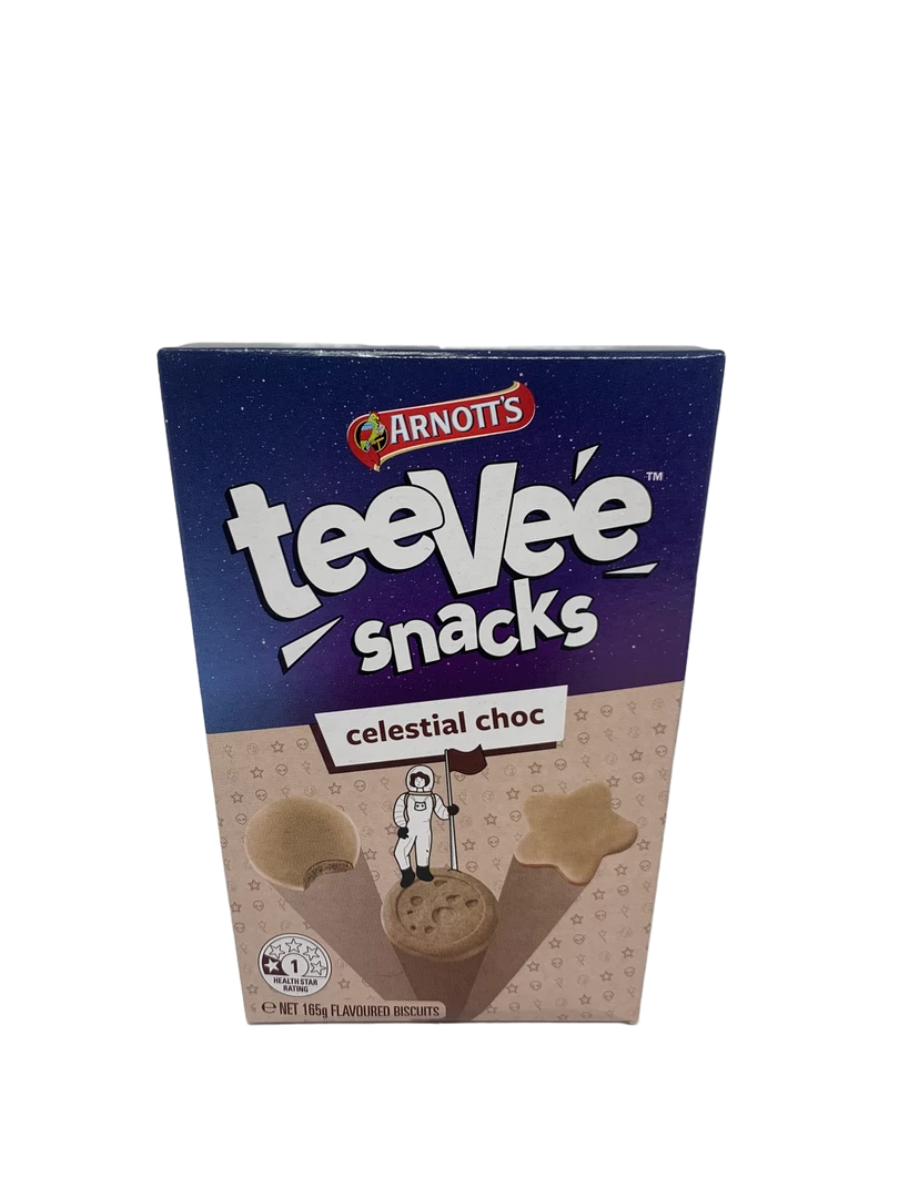 TeeVee Snacks Celestial Choc is a flavoured biscuit. Pop open for out-of-this-world bites of fun!