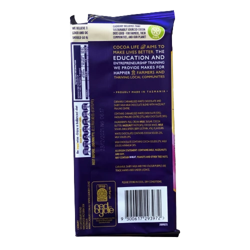 Cadbury Caramilk Marble is caramelised white chocolate & milk chocolate with a hazelnut praline centre.
