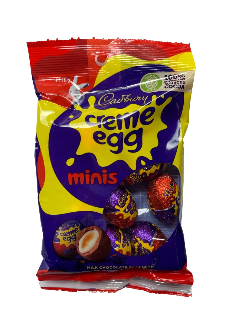 Cadbury Creme Egg Minis Egg Bag if filled with milk chocolate eggs with soft fondant centre.