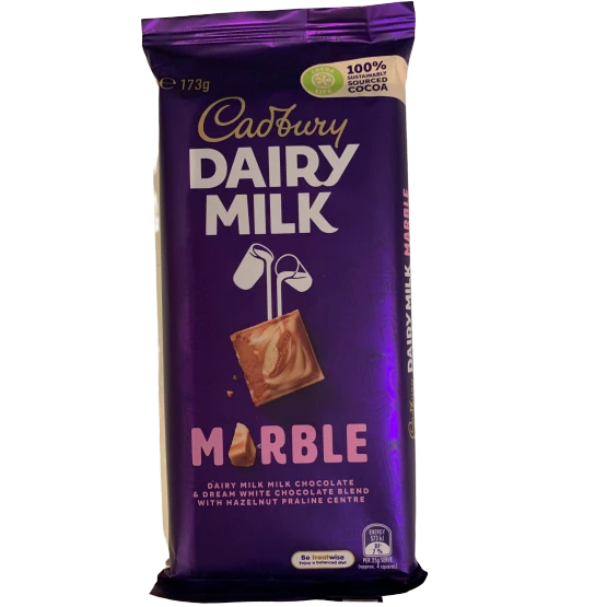 Cadbury Dairy Milk Marble contains Dairy Milk milk chocolate & dream white chocolate blend with hazelnut praline centre.