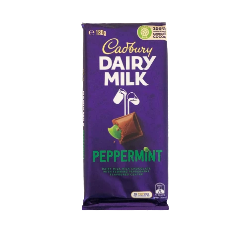 Cadbury Dairy Milk Peppermint is a Dairy Milk milk chocolate with flowing peppermint flavoured centre.