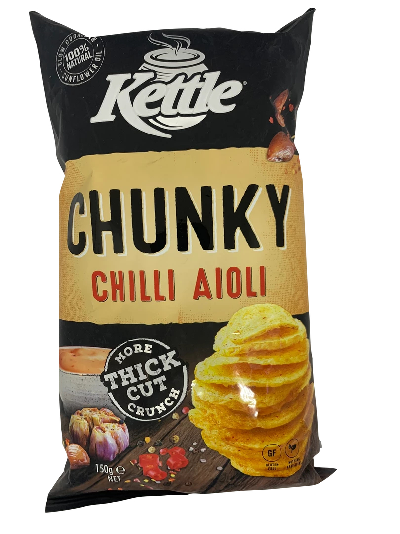 Chilli aioli flavoured potato chips For these Kettle chunky chips we’ve sliced our potatoes even thicker for an extra crunchy bite. A delightful discovery in the Kettle kitchen indeed! We found our chilli aioli recipe to be a harmonious blend of creamy, tangy and warming flavours. We hope you enjoy this deliciously crunchy Kettle chip.