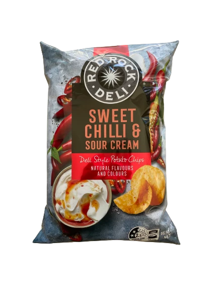 Red Rock Deli Potato Chips Sweet Chilli & Sour Cream blend a subtle kick of chillies and paprika with the smooth tanginess of sour cream with all naturals colours and flavours.
