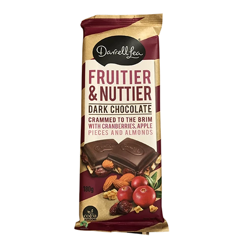 Dark Chocolate (77%) [Sugar, Cocoa Mass, Cocoa Butter, Butter Oil (Milk), Emulsifiers (322 (Soy), 476), Natural Flavour], Roasted Almonds (9%), Cranberries Dried (9%) [Cranberries, Sugar, Vegetable Oil], Apple Dried (5%), Dark Chocolate contains minimum 47% Cocoa Solids
