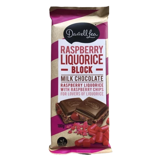 Darrell Lea makes it better. Better chocolate has to mean better for everyone. That’s why we’re proud to tell you that Darrell Lea is now 100% Palm Oil Free and uses 100% sustainably sourced cocoa in all our chocolate! Darrell Lea’s Raspberry Liquorice Chocolate Block is loaded with soft raspberry liquorice straws, lavished with crunchy raspberry chips and smothered in thick, rich, smooth Darrell Lea milk chocolate.