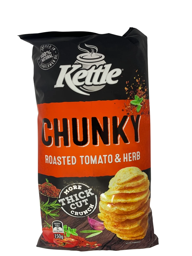 For these Kettle Chunky Chips we’ve sliced our potatoes even thicker for an extra crunchy bite. The rich and tangy flavours of roasted tomato balanced with a complex blend of our favourite herbs and spices. We hope you enjoy this deliciously crunchy Kettle chip. Now with 75% less saturated fat.
