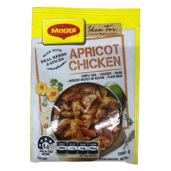 Maggi apricot chicken recipe mix is sure to be a hit at your next family dinner! This MAGGI Recipe Base is sure to deliver the right amount of sweet and savoury in every mouthful, and will make creating tasty meals easier than ever.