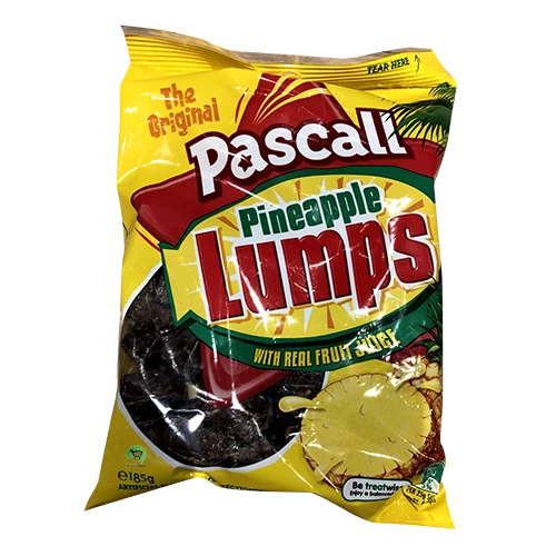 Sugar, Invert sugar, Vegetable Fat, Glucose Syrup, Cocoa Powder, Milk Solids, Gelatine, Maltodextrin (from Corn), Pineapple Juice Concentrate, Colours (100), Flavours, Emulsifiers (Soy Lecithin, 492).