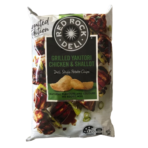 Our Grilled yakitori chicken and shallot potato chips combine the delicious sweet and salty flavour of tender grilled chicken skewers with soy and shallot.