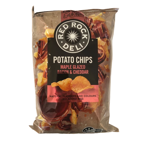 Red Rock Deli Limited Edition Potato Chips Maple Glazed Bacon & Cheddar combine the rich, sweety smoky flavour of maple bacon with the subtle creaminess of cheddar.