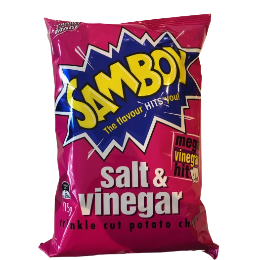 Salt & Vinegar flavoured potato chips. Whether snacking or entertaining, everyone can be hit with their favourite Samboy flavour.