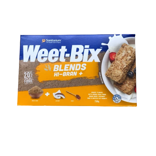 Sanitarium Weet-Bix Blends Hi-Bran Plus is a breakfast cereal made with high fibre bran and wholegrain wheat flakes, coconut and a drizzle of honey.