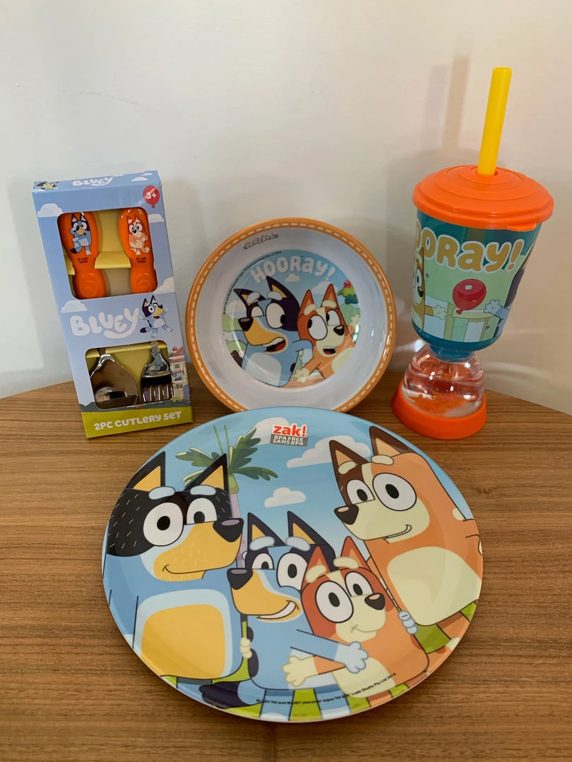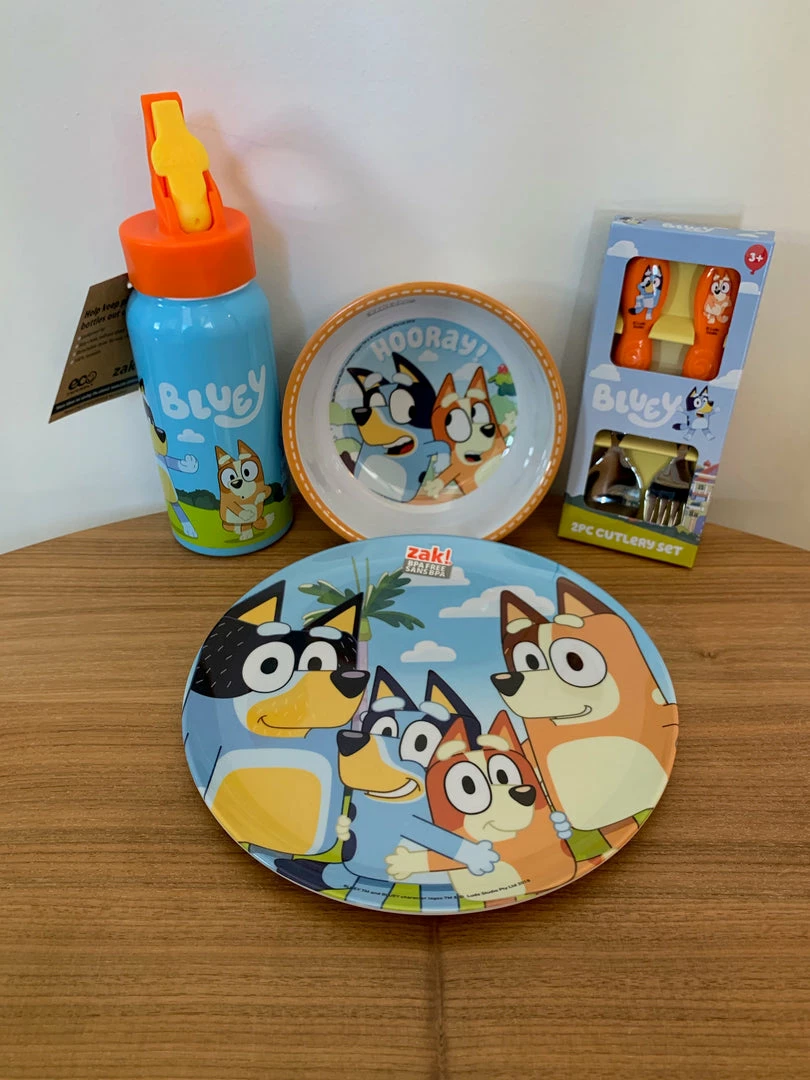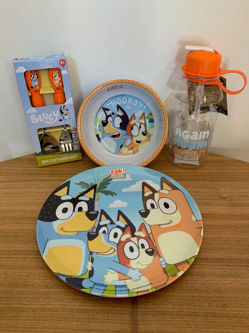 Bluey bowl, plate, cutlery set, and a choice of one of 3 water bottles.